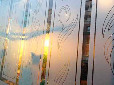 Neben einem klassischen Streifenmuster können aus einer Milchglasfolie praktisch beliebige Muster herausgeschnitten und montiert werden. Hier sehen Sie so ein Beispiel. Man muss dabei allerdings anmerken, dass solche individuell gestaltete Muster ziemlich Aufwendig in Produktion sowie Montage sind und sich dadurch im oberen Preissegment befinden.